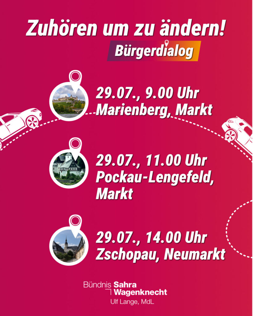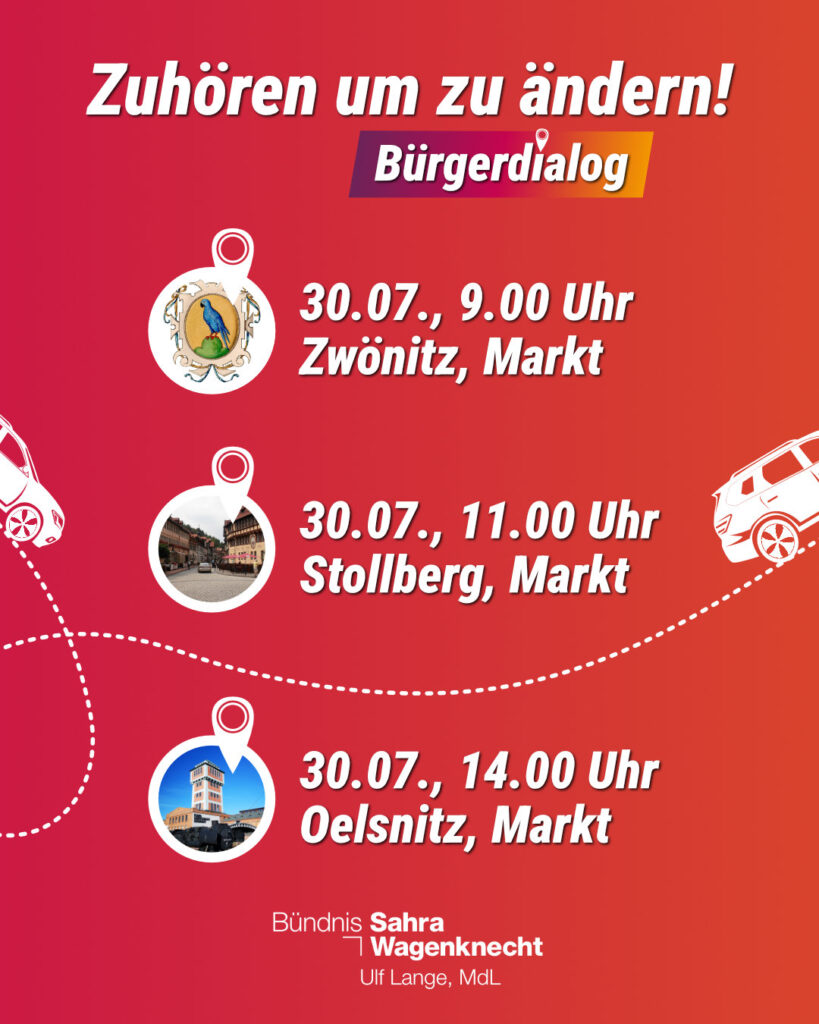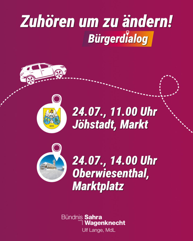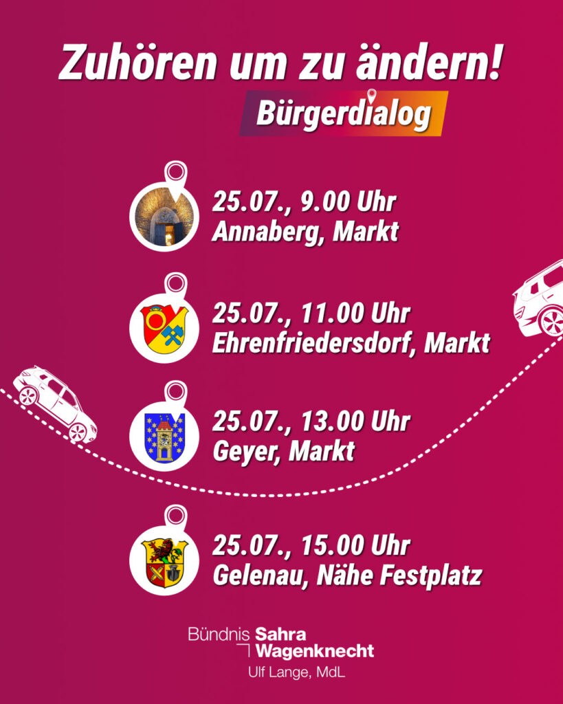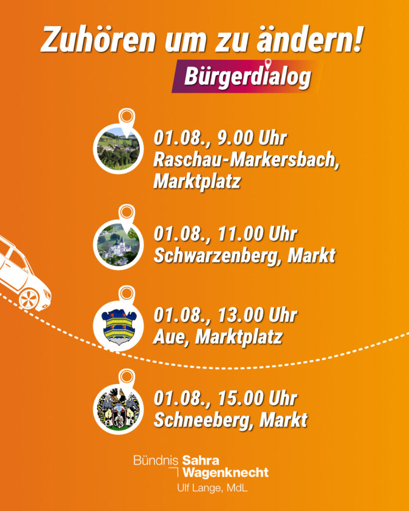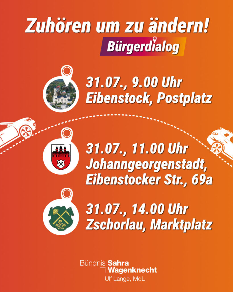 Vom 24. Juli bis 1. August bin ich – gemeinsam mit dem @bswvgerzgebirge – in verschiedenen Regionen unterwegs, um mit Ihnen ins Gespräch zu kommen.