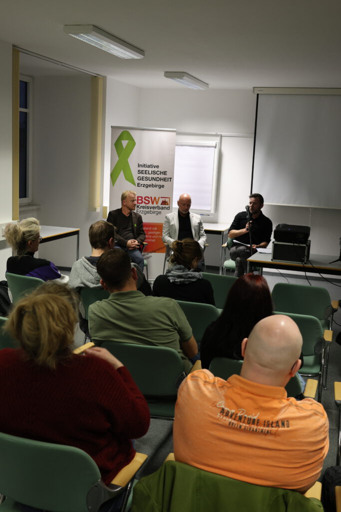 In einer Podiumsdiskussion befassten sich Sven Quilitzsch, selbst Psychotherapeut und Mitglied des Psychotherapeutenverbandes Sachsen, Thomas Bagrowski, Psychiatriekoordinator des Erzgebirgskreises und ich als Vertreter der Landespolitik mit verschiedenen Seiten dieses wichtigen Themas. Unter den Zuhörern waren einige Betroffene, die von eigenen Erfahrungen berichteten und Fragen stellten. Ein großes Problem: Trotz steigendem Therapie- und Behandlungsbedarf gibt es viel zu wenig Hilfsangebote und zu wenig Ärzte, die meist völlig überlastet sind.